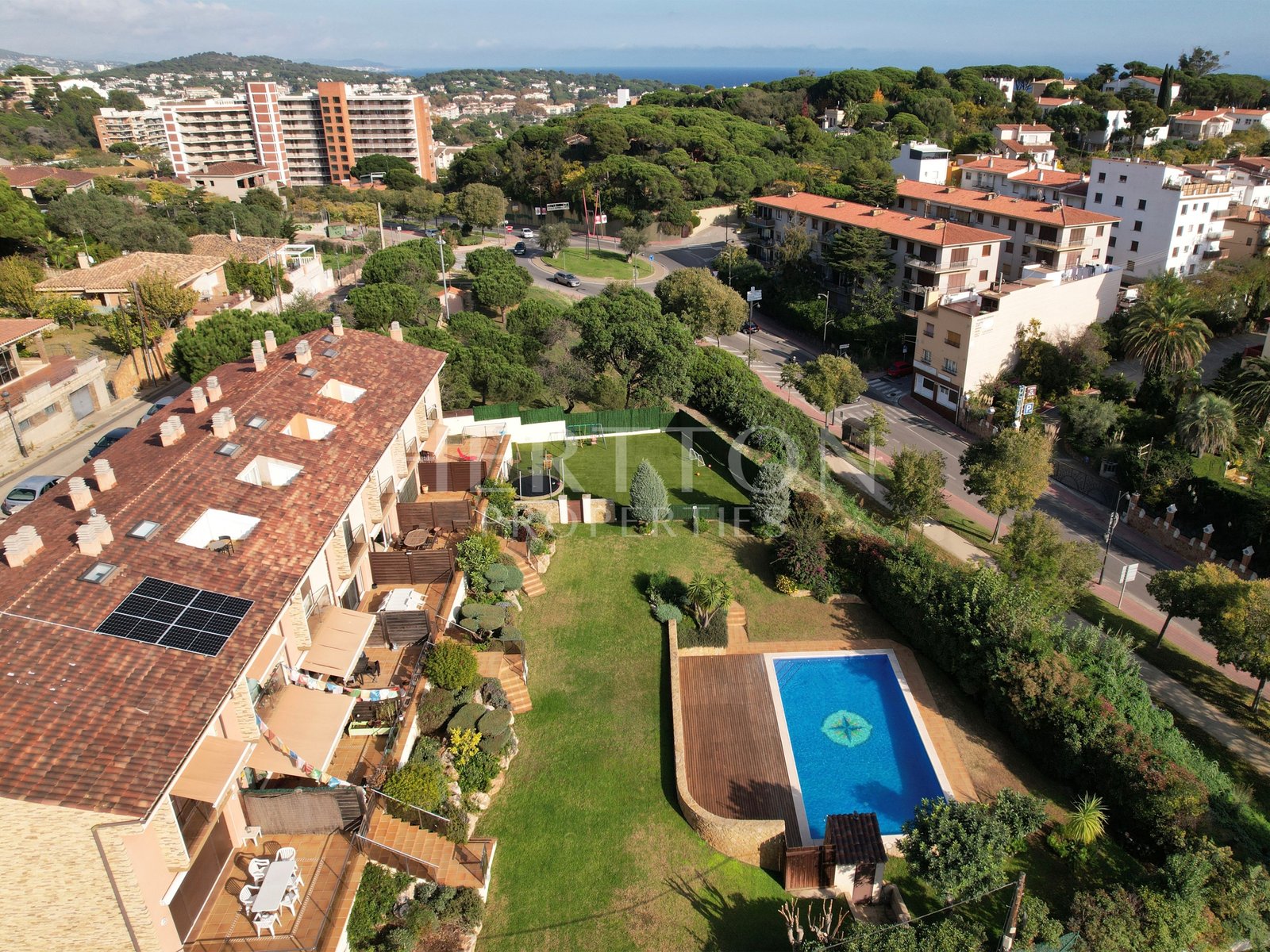 - Planta principal: gran saló menjador amb cuina oberta, pati interior, lavabo de cortesia i terrassa amb accés directe al jardí comunitari amb piscina.